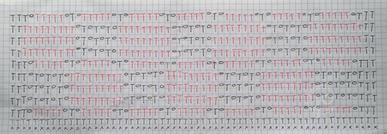 De kruisjes zijn vasten, de rondjes zijn lossen en de T- tjes zijn stokjes.